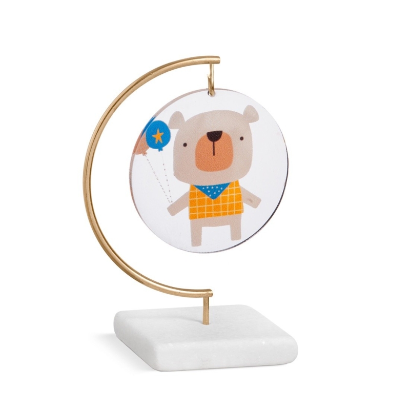 Διακοσμητική μπομπονιέρα με σύνθεση τριών υλικών.Η σύνθεση αποτελείται από : α) στρογγυλή print plexiglass παράσταση σε διάφανο χρώμα β) μεταλλικό κρίκο σε χρυσό χρώμα γ)βάση. Η παράσταση απεικονίζει το αρκουδάκι να κρατάει μπαλόνια σε σιέλ αποχρώσεις .