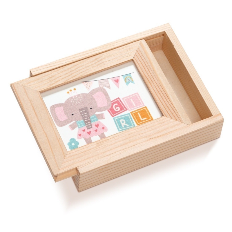 Ξύλινη κασετίνα με κορνίζα,Η κορνίζα είναι διακοσμημένη με παραλληλόγραμμο print plexiglass καδράκι σε λευκό χρώμα.Η παράσταση απεικονίζει σε οριζόντια μορφή την ελεφαντίνα σε ροζ αποχρώσεις.