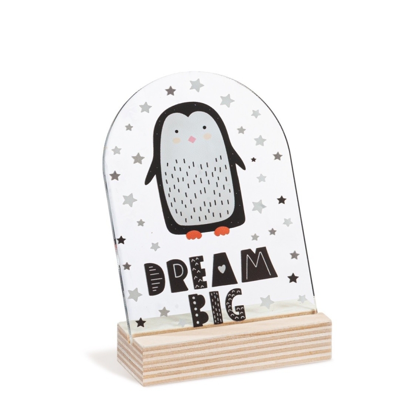 Ξύλινη βάση με print plexiglass οβαλ. Η παράσταση απεικονίζει σε διάφανο χρώμα τον πιγκουίνο και moto "DREAM BIG".