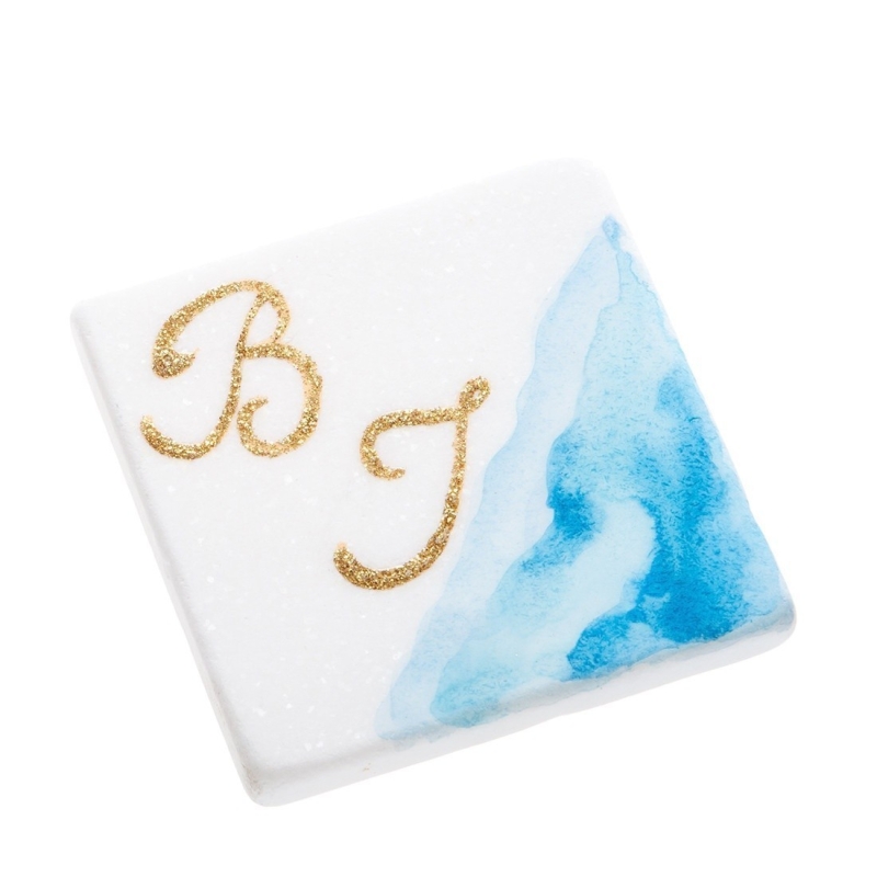 Επιτραπέζιο διακοσμητικό με βάση το μάρμαρο. Το μαρμαράκι είναι ζωγραφισμένο σε σιελ αποχρώσεις και με χρυσά μονογράμματα.
