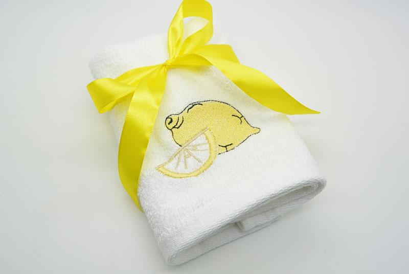Μπομπονιέρα Βάπτισης πετσέτα με κεντημένο θέμα λεμόνι.
