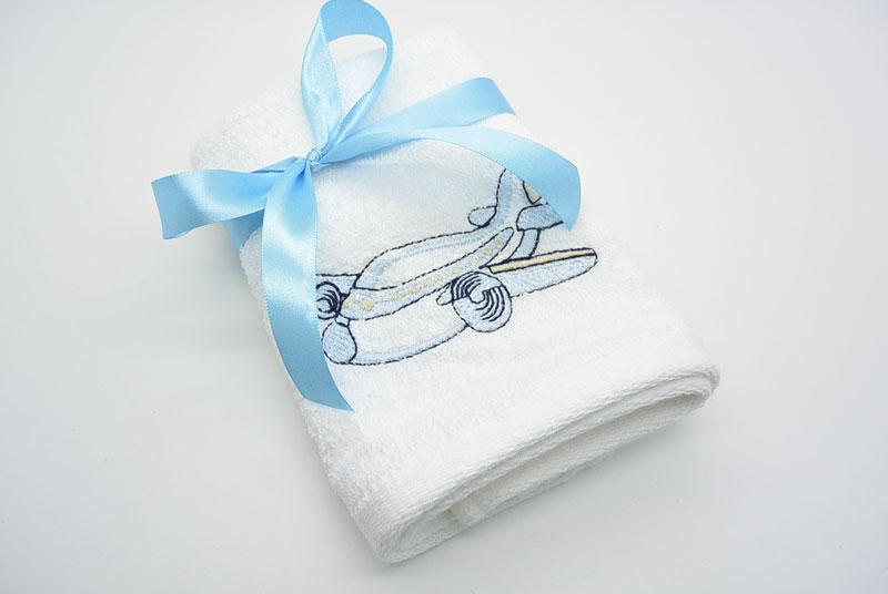 Μπομπονιέρα Βάπτισης πετσέτα με κεντημένο θέμα αεροπλανάκι.
