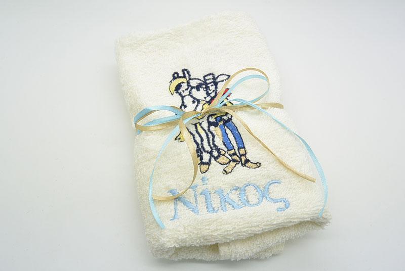 Μπομπονιέρα Βάπτισης πετσέτα με κεντημένο θέμα λούκι λουκ.