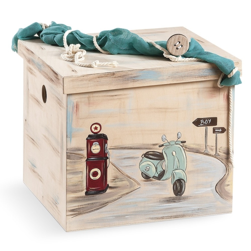 Ξύλινος natural κύβος με καπάκι, συσκευασία βάπτισης ζωγραφισμένη στο χέρι με θέμα τη βέσπα σε βεραμάν χρώμα να φαίνεται πως σταματάει δίπλα σε μία κόκκινη αντλία βενζίνης. Το καπάκι του κουτιού διακοσμεί γάζα βεραμάν με κορδόνι εκρού και ξύλινο κουμπί ενώ όλο το κουτί έχει σβησίματα σε καφέ-βεραμάν αποχρώσεις