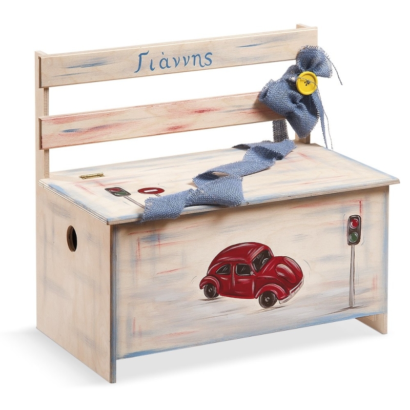 Ξύλινο natural παγκάκι, συσκευασία βάπτισης ζωγραφισμένη στο χέρι με σκαραβαίο κόκκινο και σήματα οδικής κυκλοφορίας. Η πλάτη από το παγκάκι έχει σβησίματα μπλε-κόκκινα, ενώ υπάρχει και η δυνατότητα αναγραφής πάνω σε αυτή του ονόματος του παιδιού που βαπτίζεται.