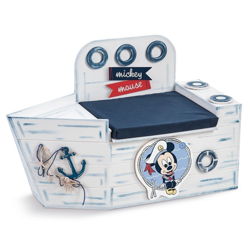 Disney ξύλινο λευκό καράβι, συσκευασία βάπτισης σε μπλε navy αποχρώσεις.Στο κατάστρωμα υπάρχει θέση όπου τοποθετείται μαξιλάρι ώστε να χρησιμοποιείται και ως σκαμπό. Στο μπροστινό μέρος είναι κολλημένη ξύλινη ναυτική παράσταση που απεικονίζει τον Mickey ναυτάκι. Στην περίμετρο υπάρχουν ξύλινα σωσίβια και μία άγκυρα που ενισχύουν το ναυτικό χαρακτήρα του κουτιού.