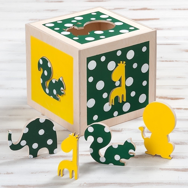 Ξύλινος natural κύβος, συσκευασία βάπτισης βαμμένος σε κίτρινη και πράσινη πουά απόχρωση και συνοδευόμενος από ξύλινα κοπτικά ζωάκια του δάσους(σκίουρο,καμηλοπάρδαλη,ελέφαντα, λιοντάρι). Το κουτί λειτουργεί και σαν παιχνιδόκουτο στο οποίο το παιδί προσπαθεί να ταιριάξει τα σωστά ζωάκια του δάσους στα σωστά κενά κάθε πλευράς.
