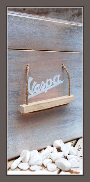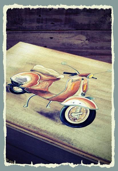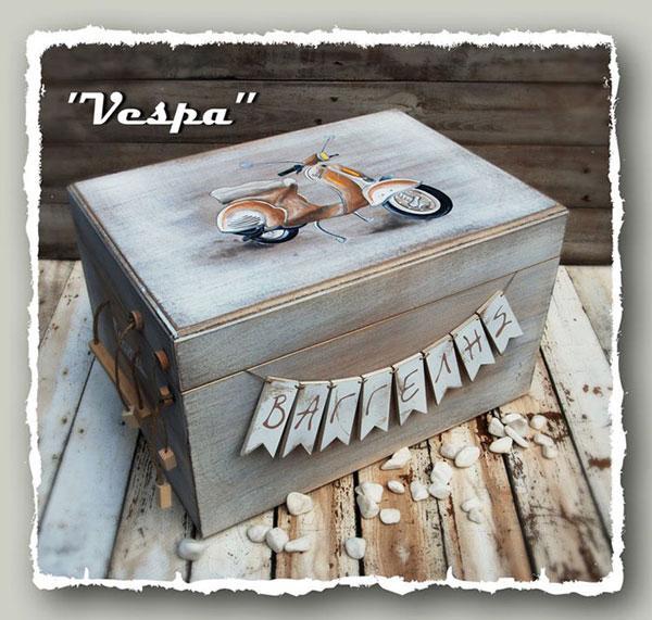Ξύλινο Κουτί βάπτισης χειροποίητο με θέμα βέσπα. Διαστάσεις κουτιού 48 εκ μήκος x 34,5 εκ πλάτος x 28 εκ ύψος.