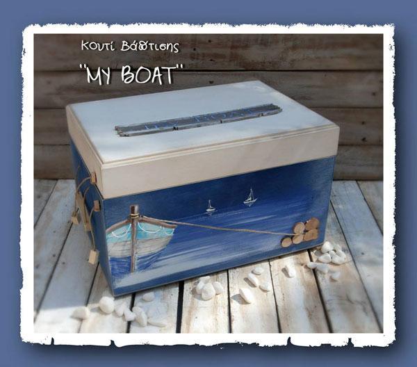 Ξύλινο Κουτί βάπτισης χειροποίητο με θέμα καράβι. Διαστάσεις κουτιού 48 εκ μήκος x 34,5 εκ πλάτος x 28 εκ ύψος.