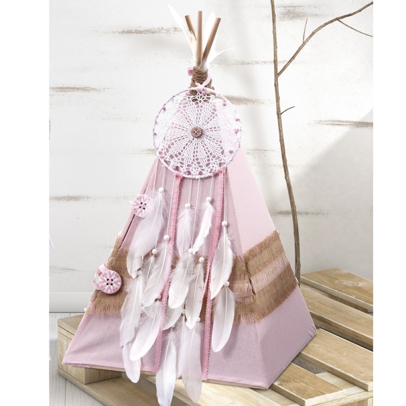 Ξύλινη natural σκηνή , συσκευασία βάπτισης ντυμένη με ύφασμα ροζ και διακοσμημένη με ονειροπαγίδα πλεκτή λευκή από την οποία κρέμονται πολλά λευκά φτερά και δαντέλες ροζ. Στη μέση της σκηνής περίπου και περιμετρικά υπάρχει τσουβάλι καφέ με ξέφτια και βαμμένο στη μέση ροζ , ενώ η σκηνή κλείνει με μεγάλα ξύλινα κουμπιά ροζ.