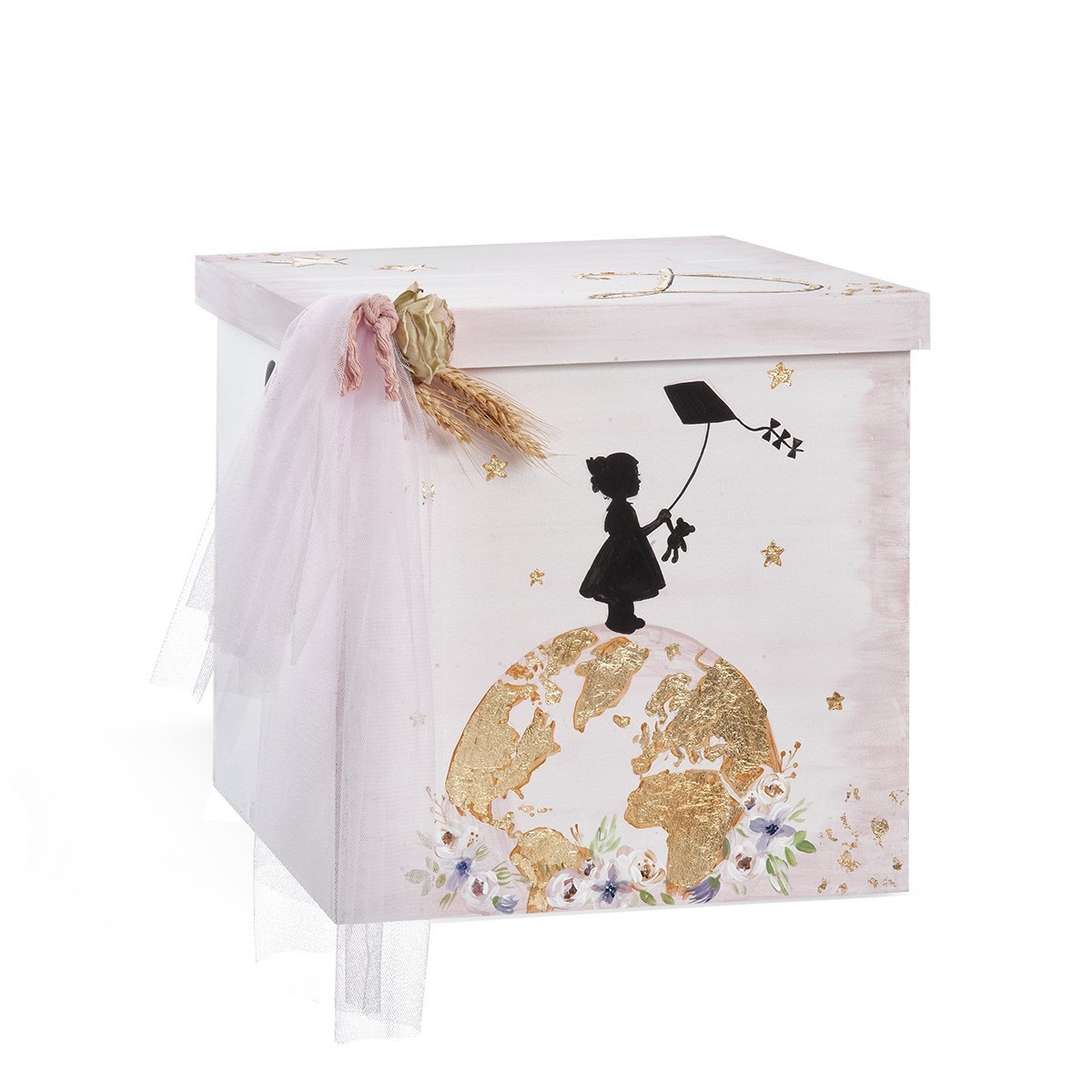 "hello world, hello little girl" Ξύλινη συσκευασία βάπτισης σχήματος κύβου σε brush ροζ απόχρωση. Στο μπροστινό μέρος είναι ζωγραφισμένη η υδρόγειος με χρυσές λεπτομέρειες και η σκιαγράφηση ενός μικρού κοριτσιού που κρατάει χαρταετό. Στο καπάκι απεικονίζεται το αρχικό του ονόματος του παιδιού σε χρυσό χρώμα. Για τις χρυσοτυπίες έχουν χρησιμοποιηθεί φύλλα χρυσού.