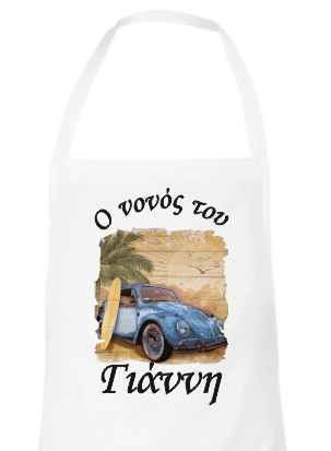 Λευκή ποδιά για το νονό ή τη νονά, εκτυπωμένη με θέμα "Σκαραβαίος". Γράψτε στα σχόλια μέσα στο καλάθι το όνομα του παιδιού σας. Σε κόκκινο ή σιέλ χρώμα.