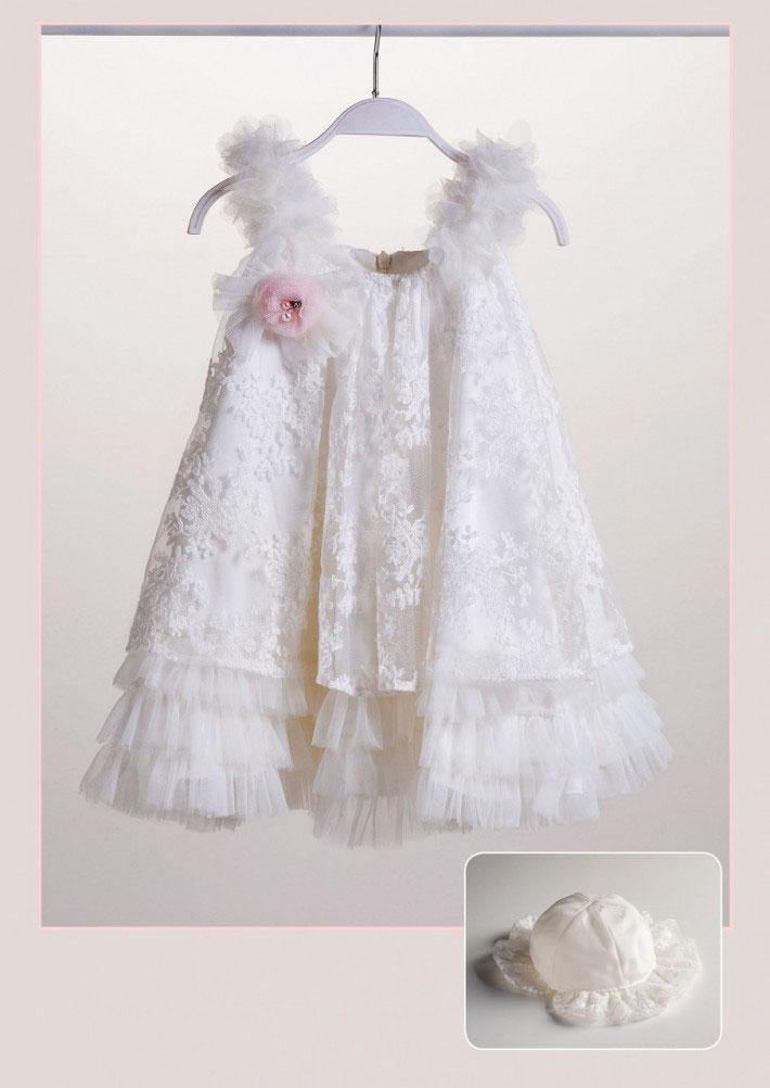 Φόρεμα από κεντητή δαντέλα λευκή με τρία βολάν από γαλλικό μαλακό τούλι. Συνδυάζεται με ασορτί καπέλο με δαντέλα.