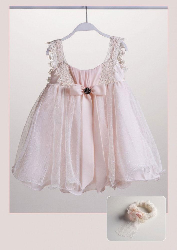 Φόρεμα από σομόν μουσελίνα, πουά τούλι και δαντέλα, στολισμένο με διακριτικό κοσμηματάκι. Συνδυάζεται με κορδέλα για τα μαλλάκια