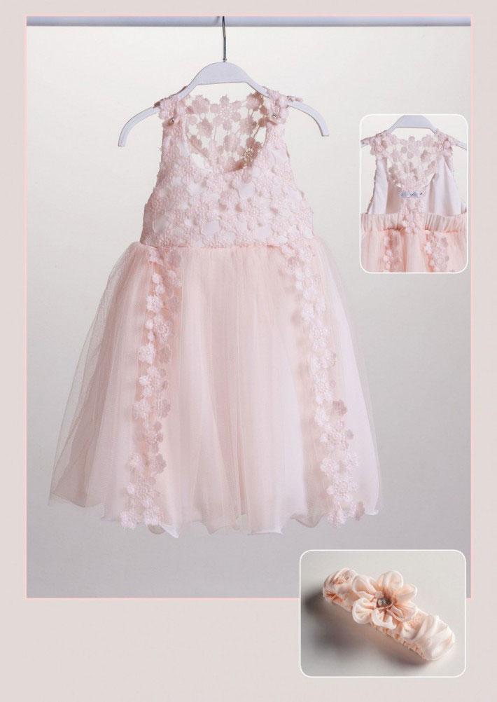 Φόρεμα σομόν με δαντέλα από μαργαρίτες και τούλι με ιδιαίτερη πλάτη. Συνδυάζεται με κορδέλα για τα μαλλάκια.