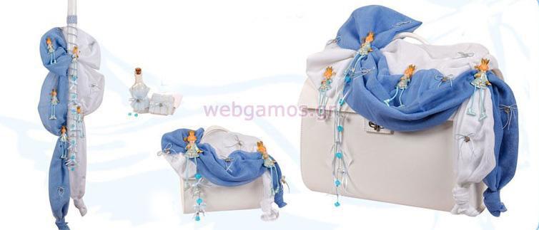 Οικονομικό Σετ βάπτισης με βαλίτσα βαπτιστικών στολισμένο σε λευκό - σιέλ  απόχρωση με θέμα αγοράκι πρίγκιπας. Η τιμή περιλαμβάνει βαλίτσα βάπτισης στολισμένη, βαλιτσάκι λαδικού στολισμένο, λαμπάδα βάπτισης στολισμένη, σετ λαδόπανα και εσώρουχα, σαπουνάκι και μπουκαλάκι για το λάδι στολισμένο και 3 κεράκια.