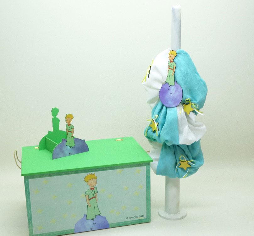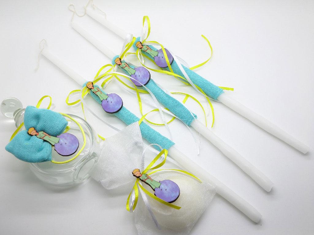 Σετ Βάπτισης μικρός πρίγκιπας.  Το σετ περιλαμβάνει κουτί βάπτισης, λαδόπανα, λαμπάδα και σετ λαδικού στολισμένα στο ίδιο θέμα.