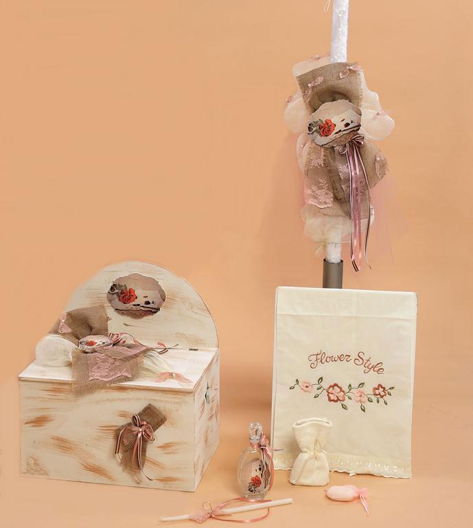 Οικονομικό Σετ βάπτισης με θέμα λουλούδι σε εκρού απόχρωση. Περιλαμβάνει παγκάκι ξύλινο με σχέδιο κορώνα, σετ λαδόπανα και εσώρουχα, σετ λαδικού και λαμπάδα βάπτισης στολισμένα όλα στο ίδιο θέμα.