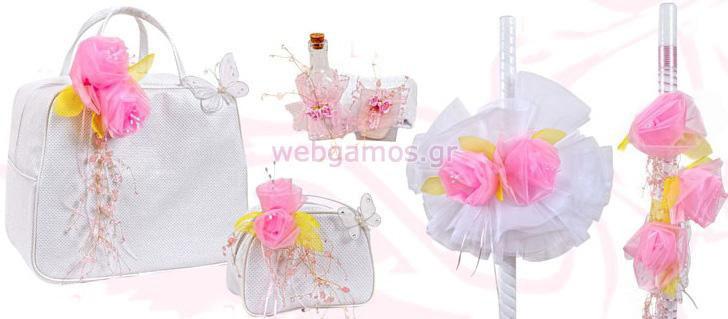Οικονομικό Σετ βάπτισης με βαλίτσα βαπτιστικών στολισμένο με τριανταφυλλάκια ροζ. Η τιμή περιλαμβάνει βαλίτσα βάπτισης στολισμένη, βαλιτσάκι λαδικού στολισμένο, λαμπάδα βάπτισης στολισμένη, σετ λαδόπανα και εσώρουχα, σαπουνάκι και μπουκαλάκι για το λάδι στολισμένο και 3 κεράκια. Υπάρχει δυνατότητα να επιλέξετε μεταξύ 2 διαφορετικά είδη λαμπάδας.