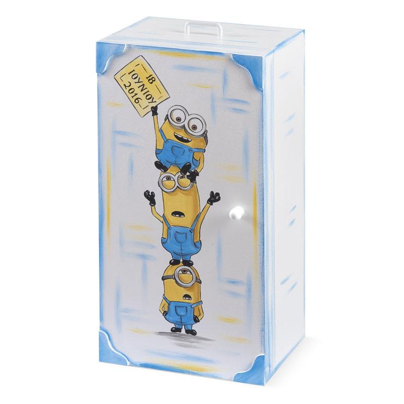 Σετ βάπτισης minions το οποίο περιλαμβάνει κουτί βάπτισης, σετ λαδόπανα, σετ λαδικού και φωτιστικό στολισμένα όλα στο ίδιο θέμα.