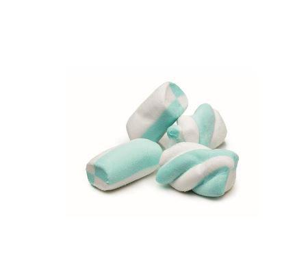 Ζαχαρωτά Marshmallow σε λευκό - σιέλ απόχρωση με γεύση φράουλα. Η τιμή αφορά συσκευασία κιλού. Το κιλό περιέχει 180 τεμάχια.