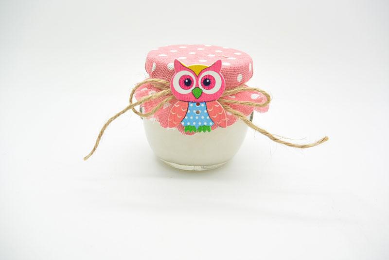 Βαζάκι Βανίλια με θέμα κουκουβάγια χωρητικότητας 106 ml. Η τιμή αφορά το βαζάκι στολισμένο. Τα χρώματα μπορούν να γίνουν ανάλογα με τα χρώματα της βάπτισής σας.