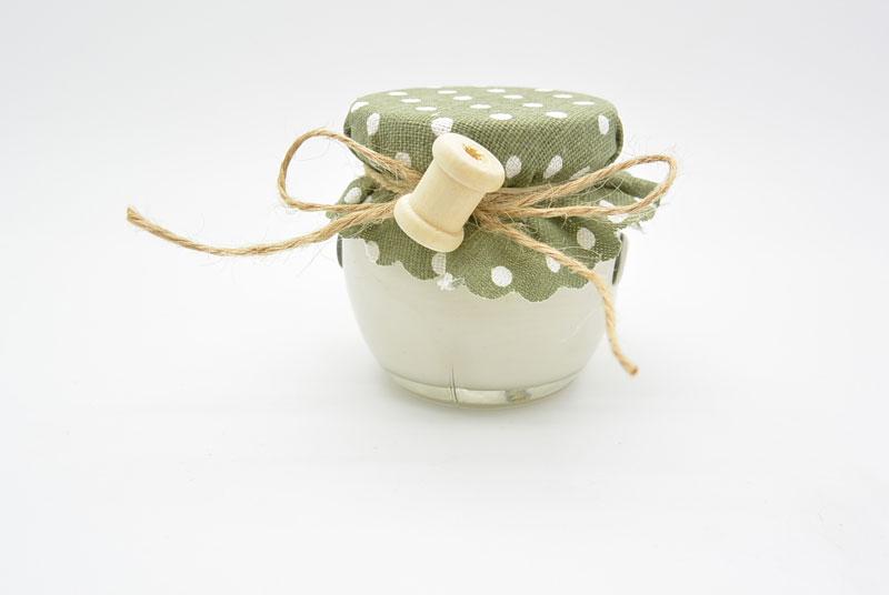 Βαζάκι Βανίλια με θέμα ραπτική χωρητικότητας 106 ml. Η τιμή αφορά το βαζάκι στολισμένο. Τα χρώματα μπορούν να γίνουν ανάλογα με τα χρώματα της βάπτισής σας.