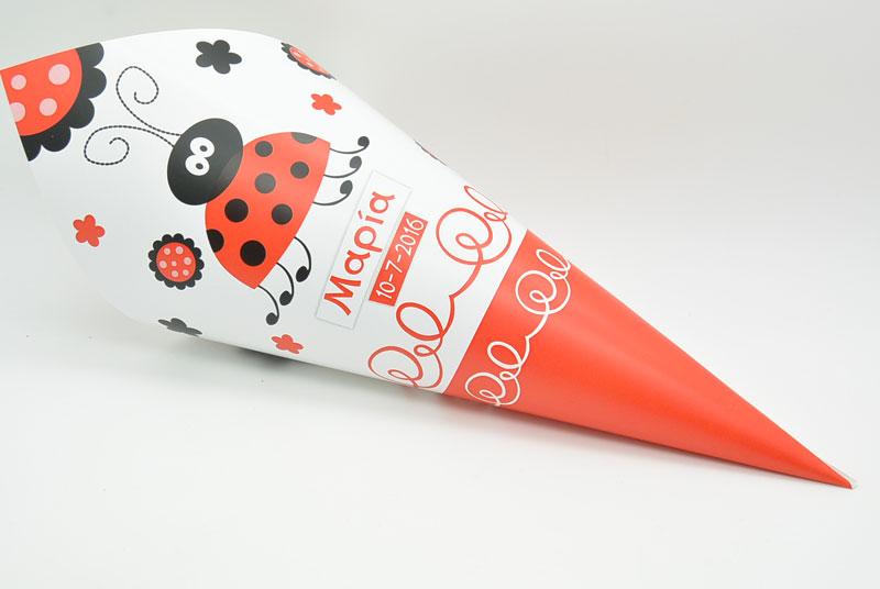 Χωνάκι Βάπτισης με θέμα πασχαλίτσα για ζαχαρωτά σε διαστάσεις 20 x 20 εκ. Μπορούμε να προσαρμόσουμε όποια φιγούρα θέλετε.