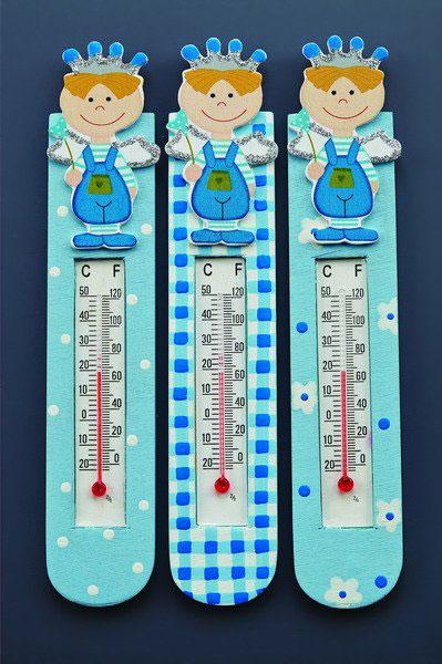 Μπομπονιέρα βάπτισης ξύλινο θερμόμετρο με σχέδιο αγοράκι πρίγιπας. Στην τιμή περιλαμβάνονται το δέσιμο της μπομπονιέρας με 7 κουφετάκια smarties. Διαστάσεις 16 cm.