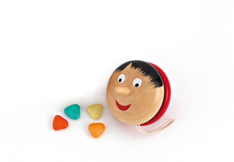 Μπομπονιέρα βάπτισης σβούρα πινόκιο. Στην τιμή περιλαμβάνονται το δέσιμο της μπομπονιέρας με 9 κουφετάκια smarties ή 5 κουφέτα αμυγδάλου. Διαστάσεις 5.8 cm.