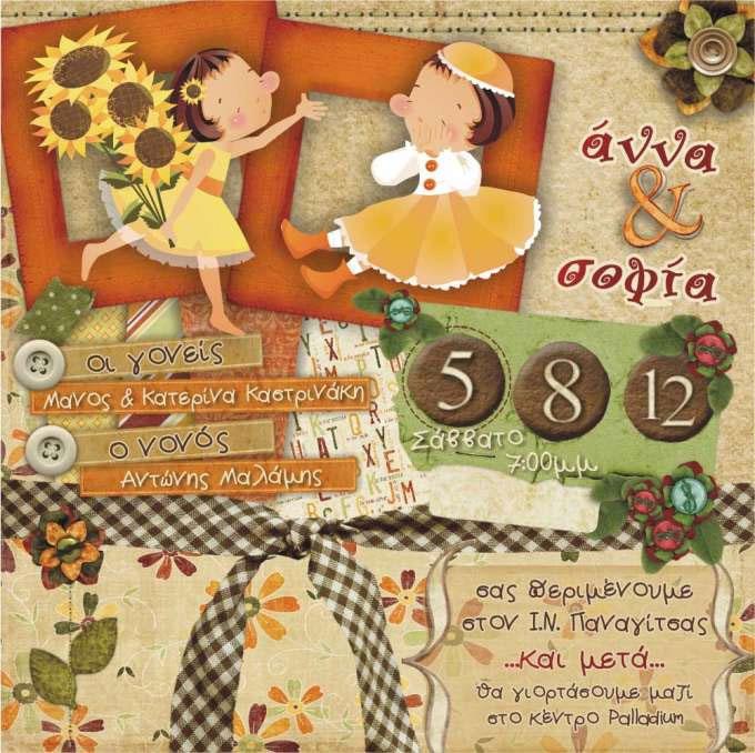 Οικονομικό Προσκλητήριο βάπτισης έγχρωμο. Προτείνεται για όλο τον χρόνο για βάπτιση σε δίδυμα κοριτσάκια. Η τιμή αφορά και την εκτύπωση. Μπορεί να γίνει σε διάφορες διαστάσεις καθώς να δωθεί και ως ρολάκι.