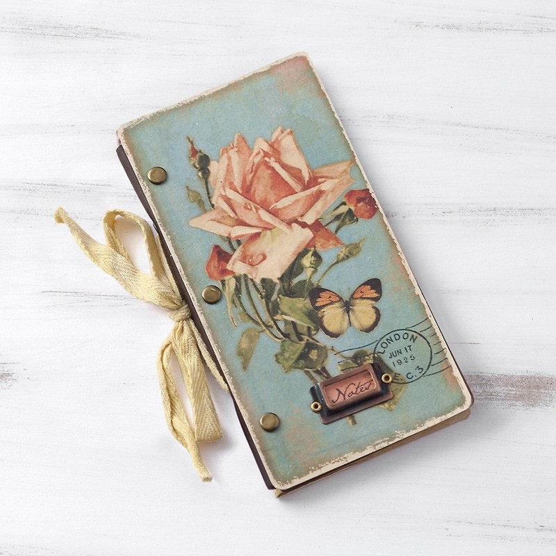 Vintage σημειωματάριο με οικολογικό χαρτί, δερμάτινο δέσιμο με κορδέλα, σχέδιο floral και πεταλούδες με 36 σελίδες.
