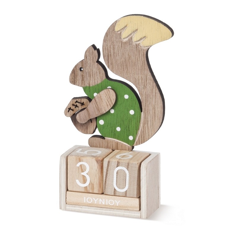 Ξύλινο διακοσμητικό ημερολόγιο με κύβους σε natural χρώο πάνω μέρος είναι διακοσμημένο με ξύλινη παράσταση σκίουρο σε πράσινο πουά χρώμα.