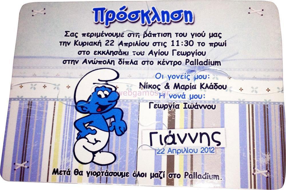 Βάπτιση | Προσκλητήριο Στρουμφάκι σε παζλ (pazl0002)