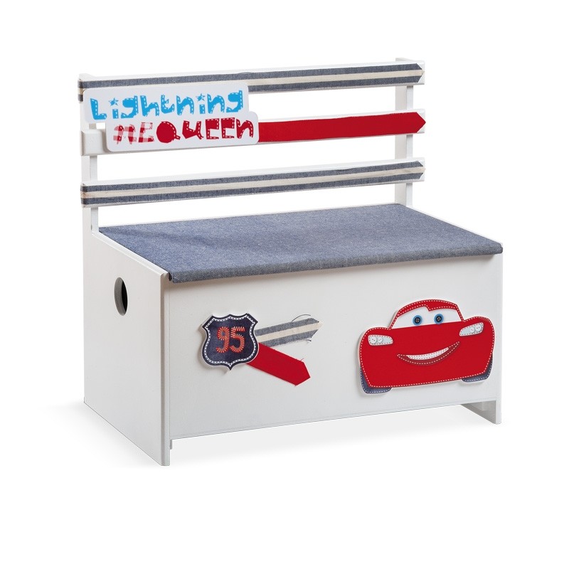 Disney ξύλινο λευκό παγκάκι, συσκευασία βάπτισης στολισμένη με ριγέ και μονόχρωμο ύφασμα σε αποχρώσεις μπλε και κόκκινες . Το κάθισμα είναι ντυμένο με μονόχρωμο μπλε λινό ύφασμα, το μπροστινό μέρος του κουτιού είναι διακοσμημένο με την ξύλινη φιγούρα του McQueen και το σήμα του αντίστοιχα ,ενώ τη πλάτη του κουτιού διακοσμεί ξύλινη ταμπελίτσα πάνω στην οποία αναγράφεται το όνομά του Lightning McQueen.