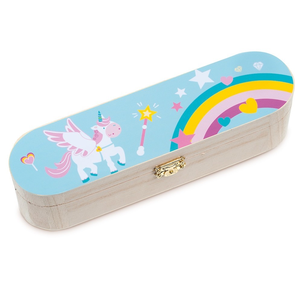 Ξύλινη natural κασετίνα με μεταλλικό κούμπωμα. Είναι διακοσμημένη με αυτοκόλλητο print μονόκερος σε σιέλ-ροζ αποχρώσεις.