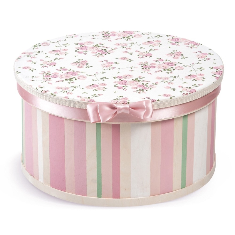 Ξύλινη natural στρογγυλή καπελιέρα, συσκευασία βάπτισης ζωγραφισμένη στο χέρι στο κάτω μέρος με ρίγες σε φυσικές-ροζ-λευκές και πράσινες αποχρώσεις. Το καπάκι είναι ντυμένο με floral ύφασμα σε αποχρώσεις λευκές-ροζ ενώ περιμετρικά είναι διακοσμημένο με σατέν ροζ κορδέλα.