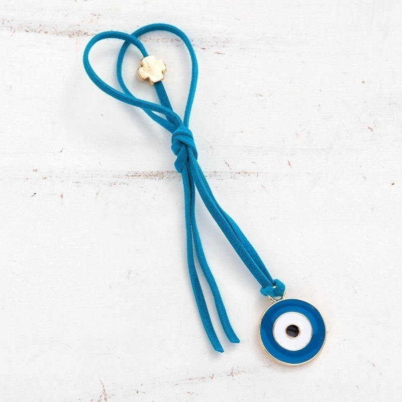 Μαρτυρικό με δέρμα suede τιρκουάζ,επίχρυσο σταυρό και μάτι στρογγυλό μπλε.