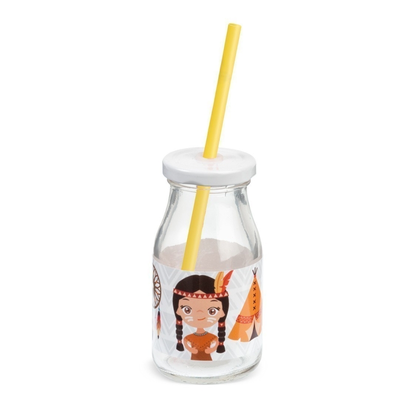 Γυάλινο μπουκάλι γάλακτος 200ml με λευκό μεταλλικό καπάκι. Συνοδεύεται από πολύχρωμα καλαμάκια. Είναι διακοσμημένο με αυτοκόλλητο print ινδιάνα.