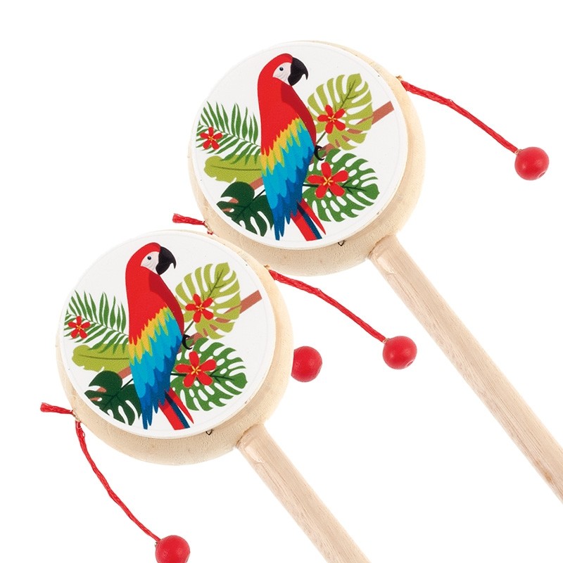 Ξύλινο natural τυμπανάκι με αυτοκόλλητο print παπαγάλος με διαφορετικό σχέδιο μπρος-πίσω.