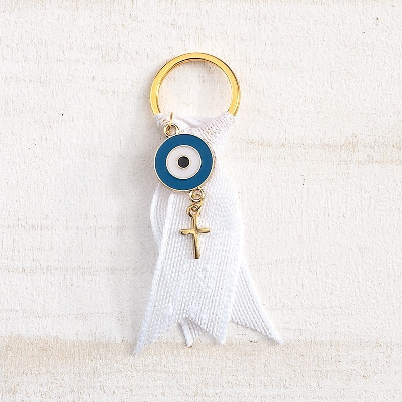 Μαρτυρικό μπρελόκ χρυσό με κορδέλα γάζας λευκή,μάτι στρογγυλό μπλε και επίχρυσο σταυρουδάκι.