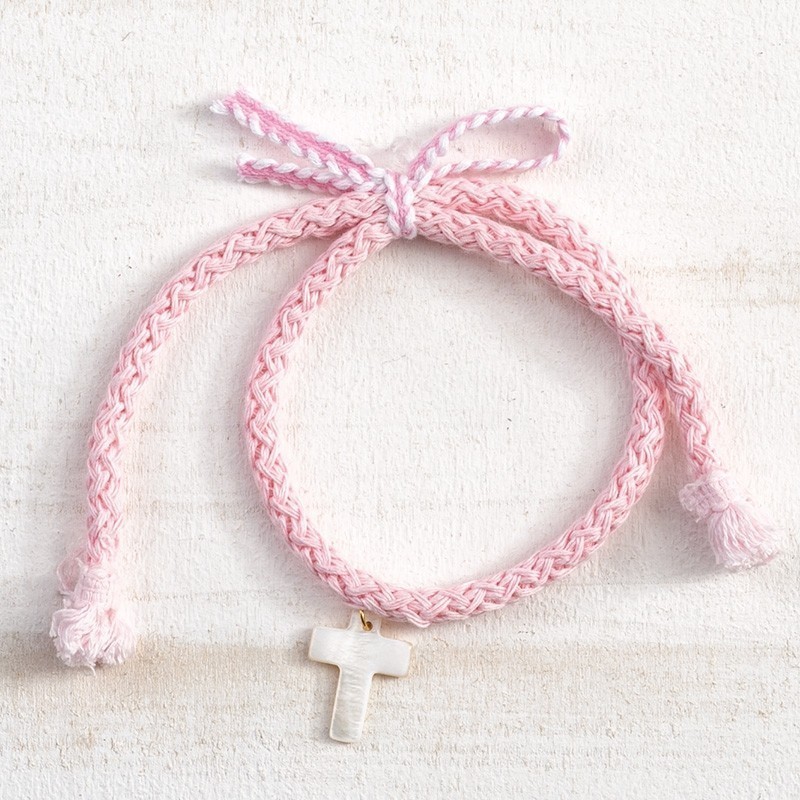 Μαρτυρικό βραχιόλι με κορδόνι πλεκτό ροζ και φίλντισι σταυροδάκι λευκό, δεμένο με βαμβακερό δίχρωμο λευκό-ροζ κορδόνι.