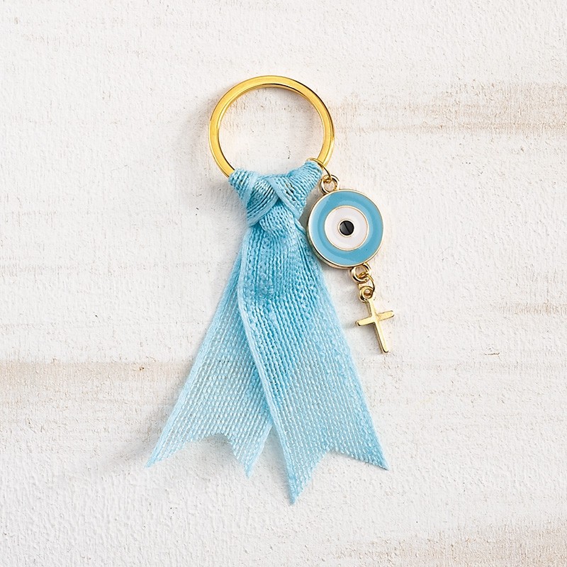 Μαρτυρικό μπρελόκ χρυσό με κορδέλα γάζας σιέλ,μάτι στρογγυλό σιέλ και επίχρυσο σταυρουδάκι.