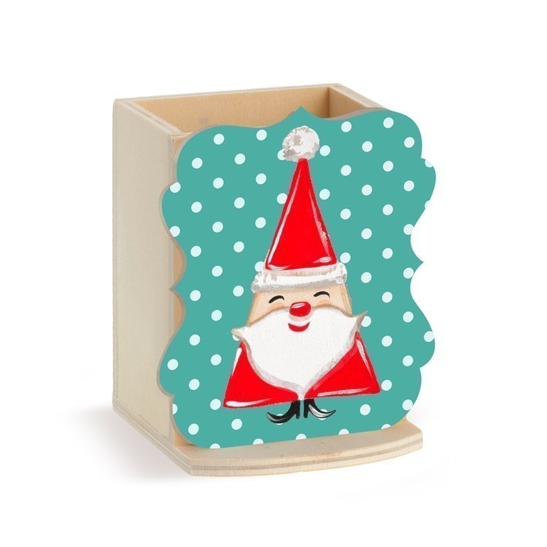 Ξύλινη μολυβοθήκη σε natural χρώμα. Διακοσμείται με κοπτικό πάνω στο οποίο απεικονίζεται ο Αγ. Βασίλης σε αποχρώσεις λευκές-κόκκινες πάνω σε βεραμάν φόντο.