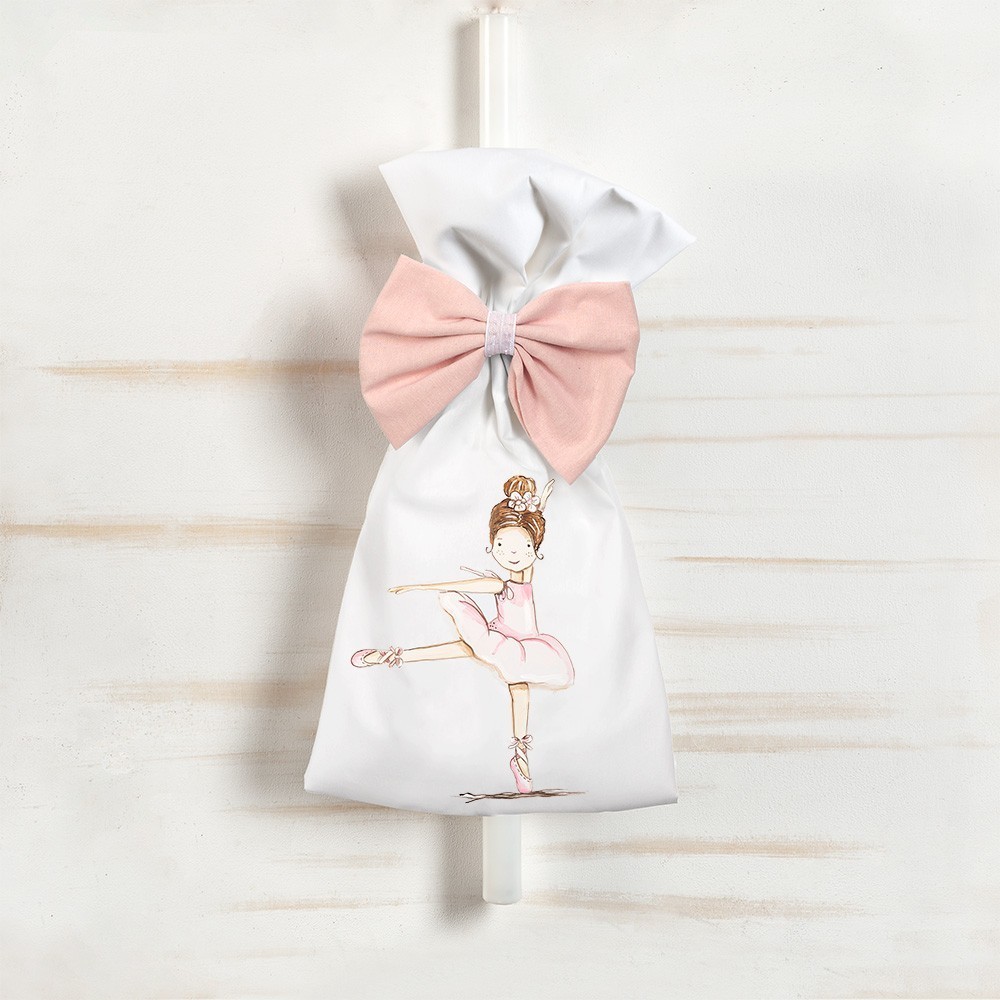 Λαμπάδα βάπτισης με θέμα μικρή μπαλαρίνα με την ροζ στολή της και τις πιρουέτες της. Είναι δεμένη με 2 φιόγκους υφασμάτινους,ο ένας σε λευκό και ο άλλος σε ροζ χρώμα. Στο λευκό φιόγκο έχει χρησιμοποιηθεί τεχνική ζωγραφικής πάνω σε ύφασμα με θέμα μικρή μπαλαρίνα που χορεύει.
