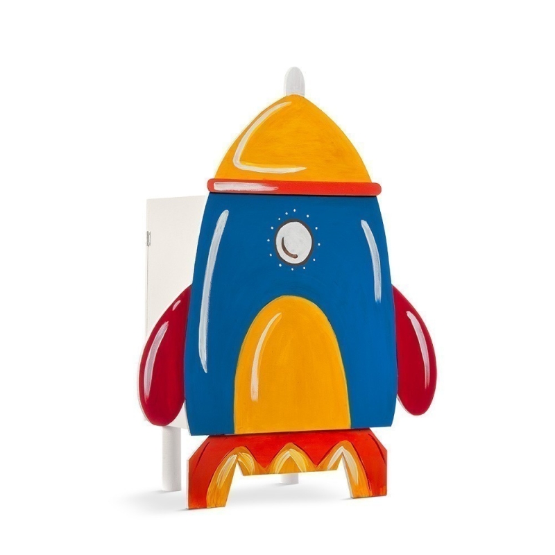 Ξύλινο κουτί σε σχήμα πύραυλος. Οι χρωματισμοί του είναι σε κίτρινο, πορτοκαλί και blue navy. Απόλυτα λειτουργικό αφού από πίσω υπάρχει ντουλαπάκι που ανοίγει ώστε να τοποθετηθούν άνετα τα βαπτιστικά. Απογειωθήκαμε και είμαστε στον αέρα.