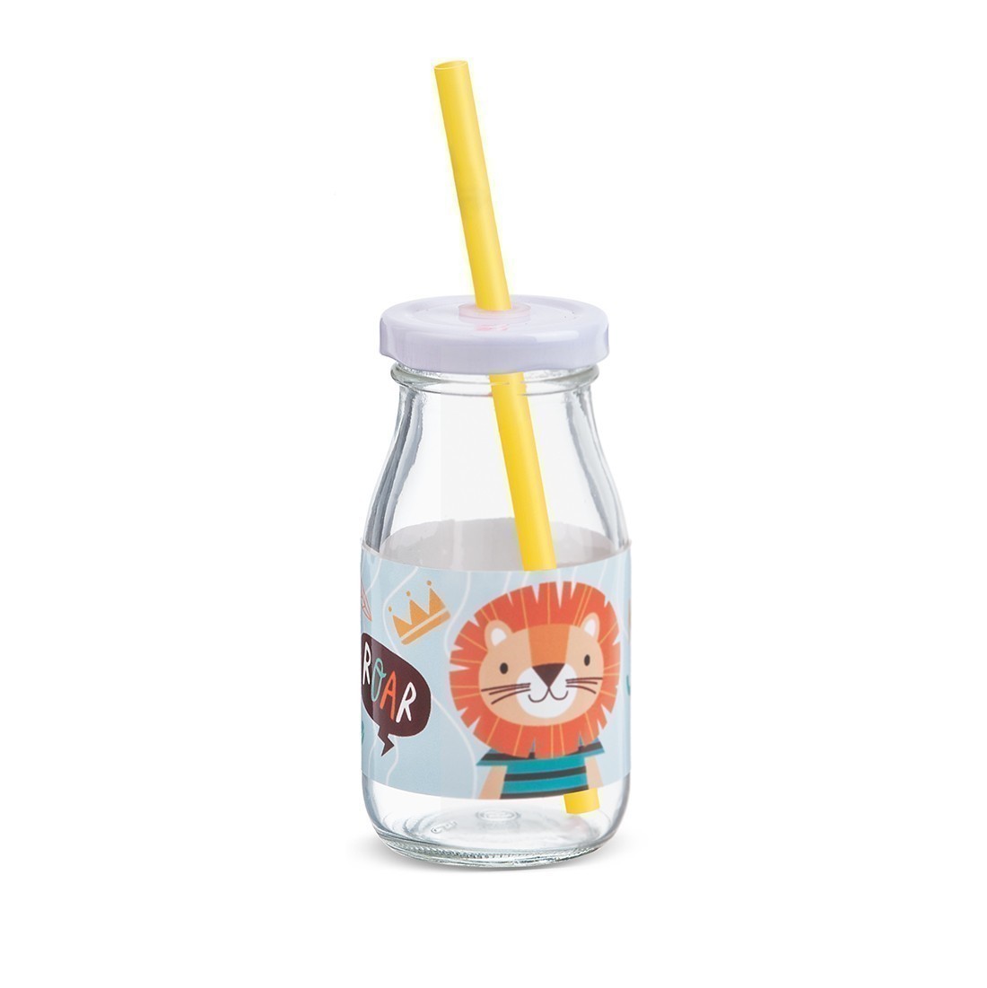 Γυάλινο μπουκάλι γάλακτος 200ml με λευκό μεταλλικό καπάκι. Συνοδεύεται από πολύχρωμα καλαμάκια. Είναι διακοσμημένο με αυτοκόλλητο print Λιοντάρι.