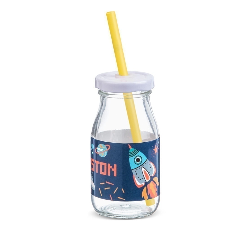 Γυάλινο μπουκάλι γάλακτος 200ml με λευκό μεταλλικό καπάκι. Συνοδεύεται από πολύχρωμα καλαμάκια. Είναι διακοσμημένο με αυτοκόλλητο print Διάστημα.