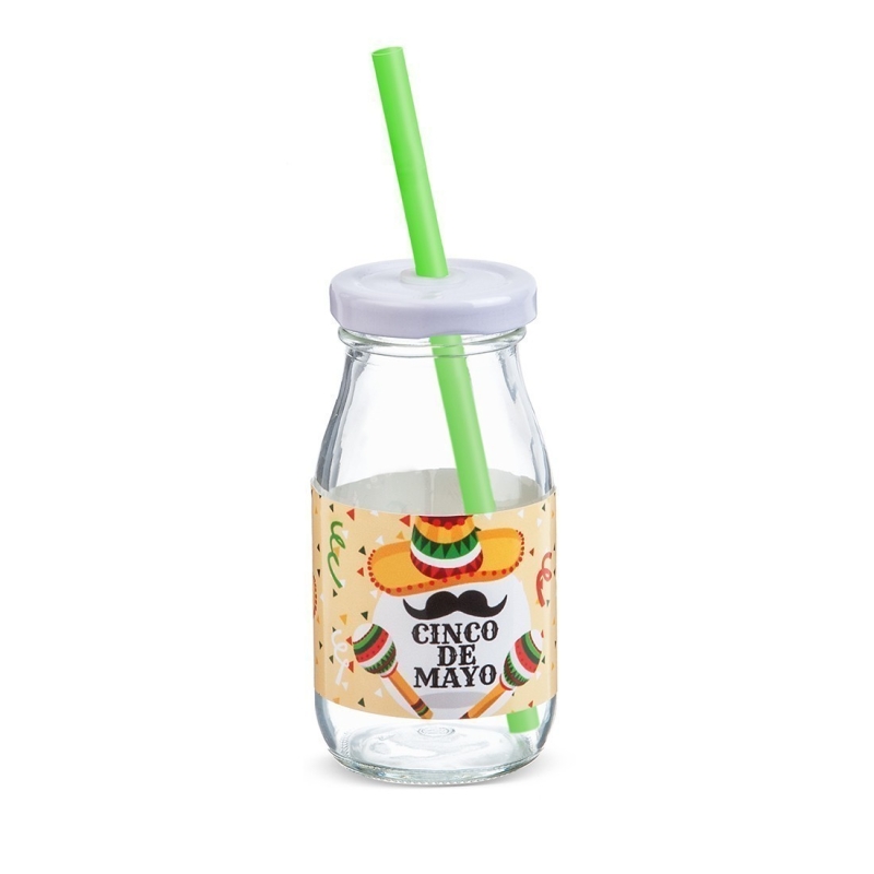 Γυάλινο μπουκάλι γάλακτος 200ml με λευκό μεταλλικό καπάκι. Συνοδεύεται από πολύχρωμα καλαμάκια. Είναι διακοσμημένο με αυτοκόλλητο print Mexican.
