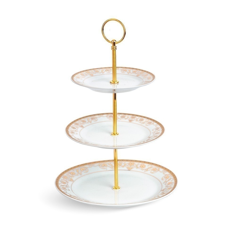 Πορσελάνινη επιτραπέζια τουρτιέρα τριών επιπέδων σε λευκό χρώμα με χρυσές λεπτομέρειες. Ιδανική παρουσίαση στις εκδηλώσεις σας για τοποθέτηση γλυκών και αλμυρών λιχουδιών.